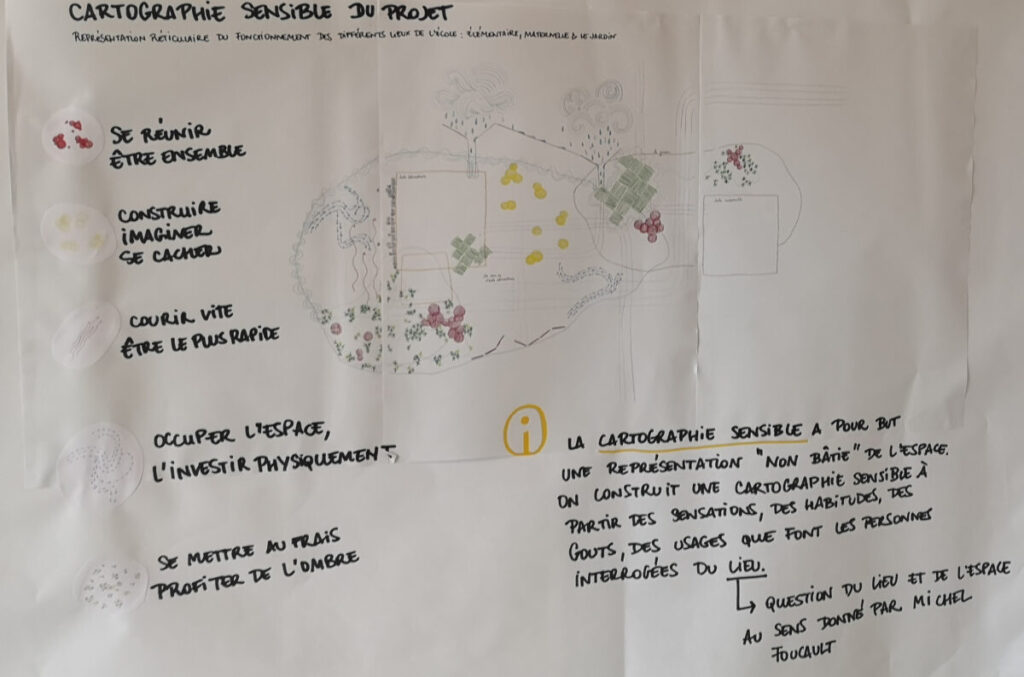 Cette dernière étape, consiste à faire la synthèse de ce qui a été imaginé pour rendre des préconisations. Celles-ci se présentent sous forme de cartographie sensible. Les préconisations retenues sont entre autre un coin de travail en extérieur, un espace conservant l’enrobé pour faciliter les jeux, un 2ème préau avec des livres et des tabourets, un changement de sol en s’appuyant sur les travaux des cours oasis (informations sur le site de la mairie de Paris), un espace extérieur ouvrant la possibilité de faire classe dehors.