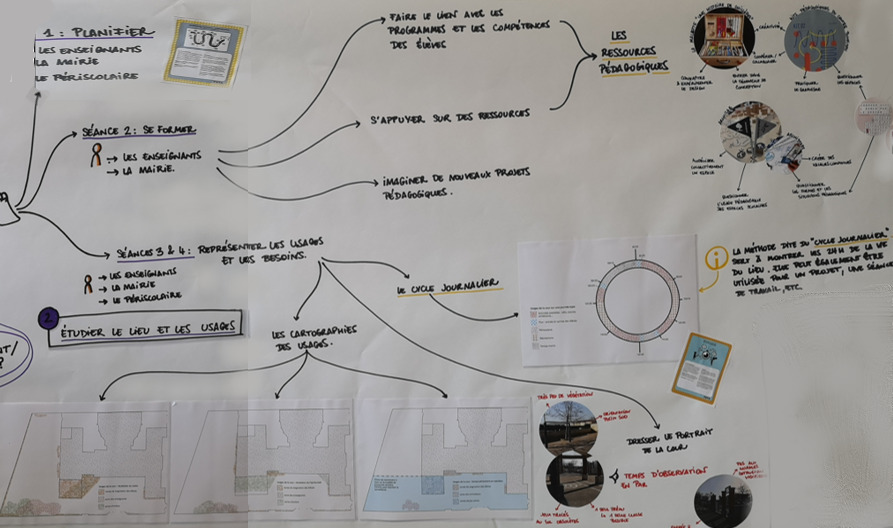 Sous l’impulsion de la designer d’espace, les adultes fréquentant l’école réalisent une cartographie des usages de la cour, de leur temporalité. Cela constitue les cycles journaliers de la cour.